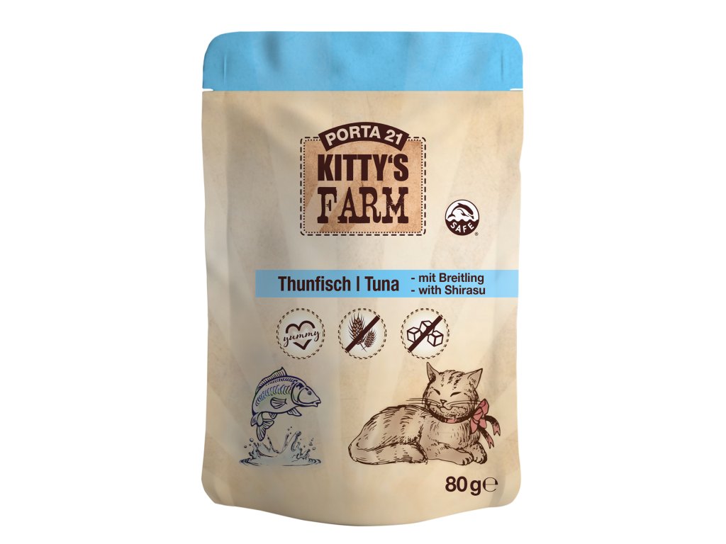 Kapsička pro kočky - Kitty´s Farm tuňák se šprotem 80 g Šťavnatá kapsička pro kočky připravovaná na páře