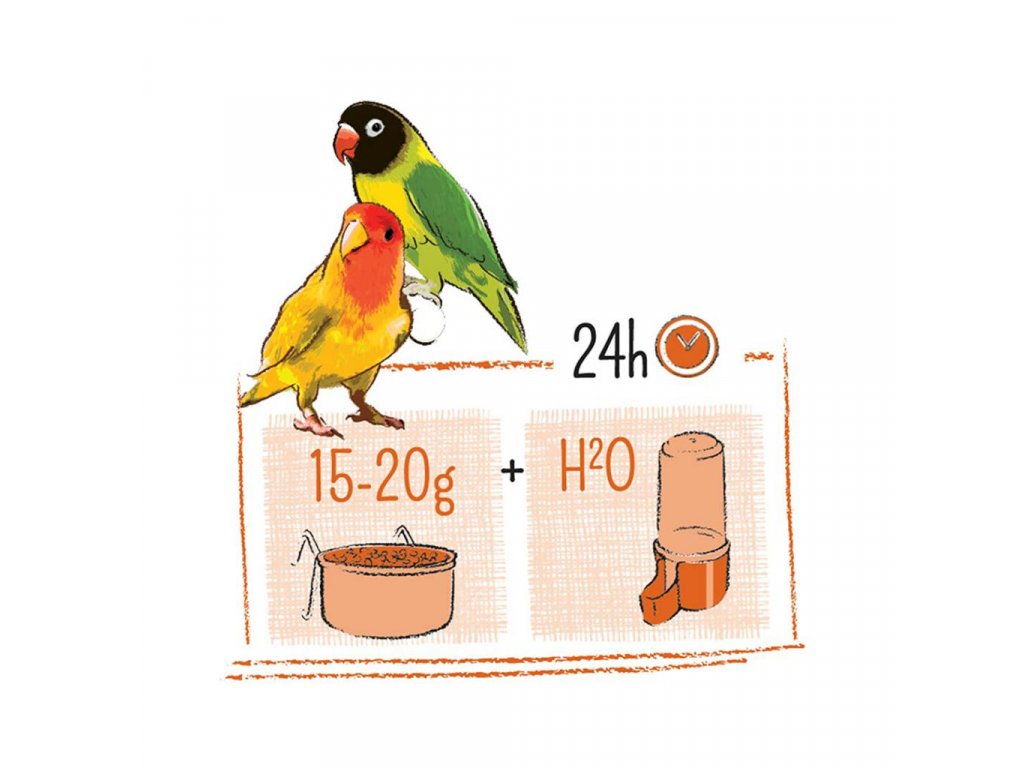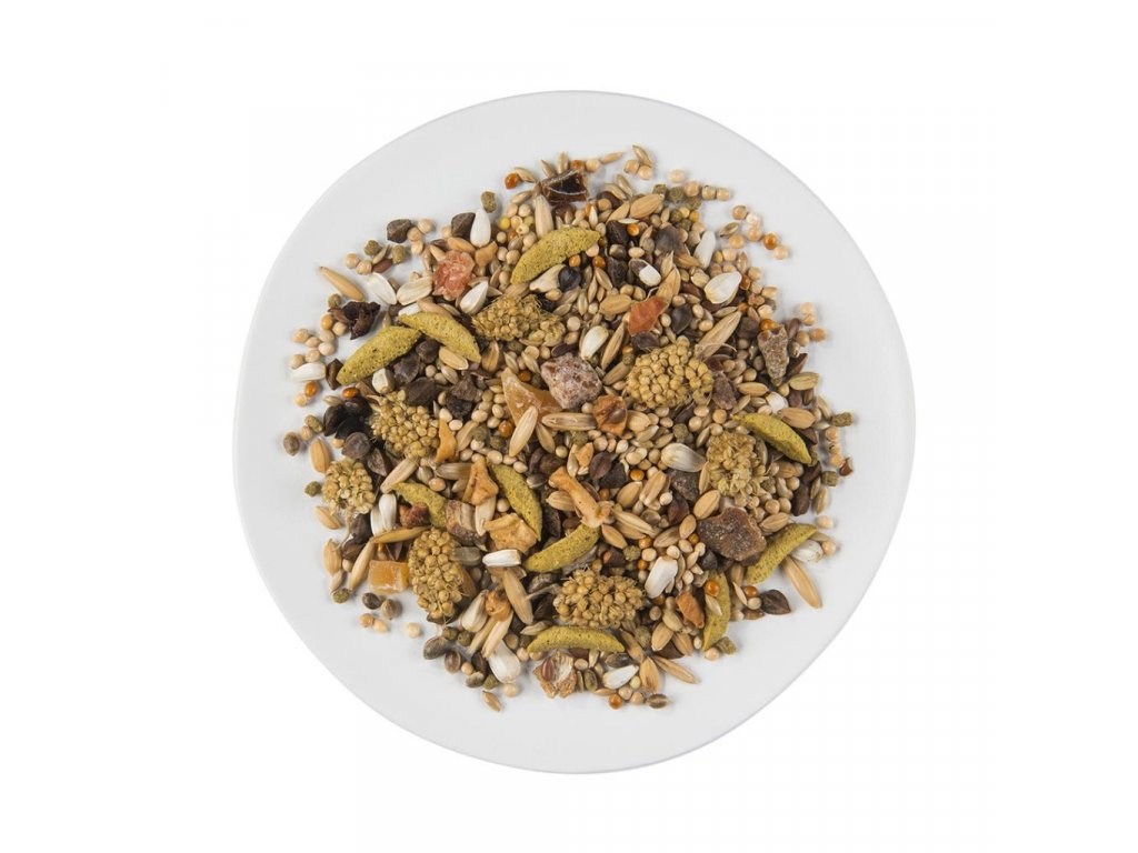 semínka (5 % slunečnicová semena), zrna (10 % pohanka, 7 % celozrnná rýže), vedlejší produkty rostlinného původu, ovoce (2 % datle), minerální látky, zelenina, oleje a tuky, vejce a vaječné výrobky (0,2 %)