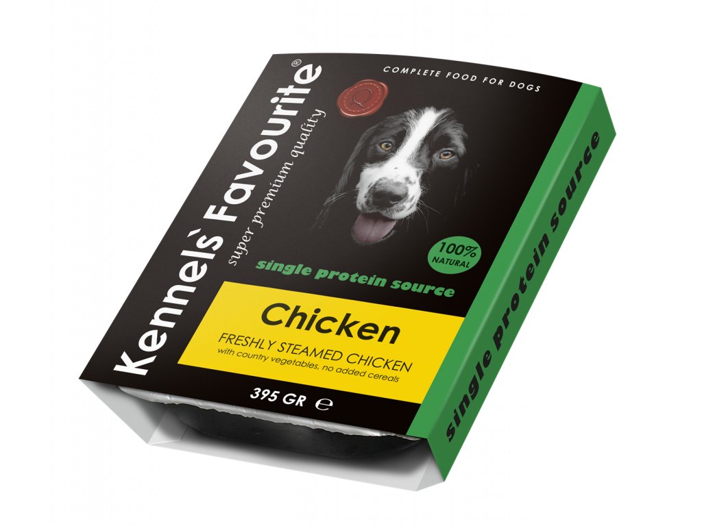 Čerstvé kuřecí maso z nizozemské farmy připravené šetrně na páře, trocha mrkve, trocha hrášku, kousky brambor, zakápnuté lososovým olejem. Utřete slinu, tuhle dobrotu připravili šéfkuchaři z Kennels' Favourite pro vašeho psího mazlíčka. Kvalitní měkká paštika neobsahuje ani špetku obilovin, umělých barviv, konzervantů nebo aromat. Ingredience jsou 100% přírodní a vaničku může váš chlupáč mlsat každý den – je to totiž plnohodnotné komplexní krmivo pro psy všech plemen i věkových kategorií. Tak honem pro misku a servírovat.