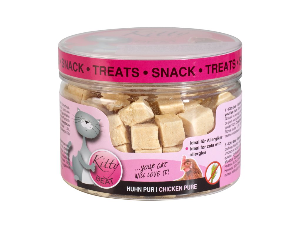 Mrazem sušené kostky svačiny jako odměna pro vaše chlupaté kamarády nebo mezi jídly. Bez lepku a mléčných výrobků. Vhodné zejména pro kočky s alergickými problémy. Dokonce oblíbené jako svačinka pro psy! Kostky, které jsou celé vyrobeny z masa kuřecích prsou, jsou svačinkou bohatou na bílkoviny a nízkým obsahem tuku.