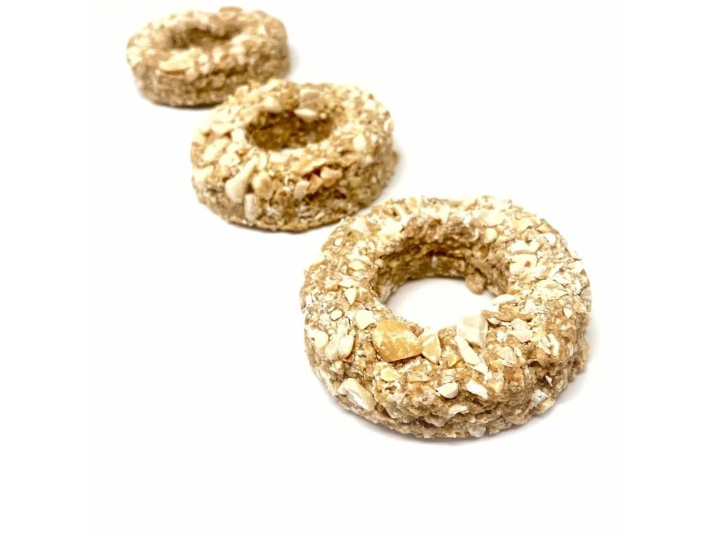 Základem všech našich donutů jsou ovesné vločky, které jsou vynikajícím zdrojem vlákniny pro bezproblémové trávení a dodávají pamlskům tu správnou strukturu.
